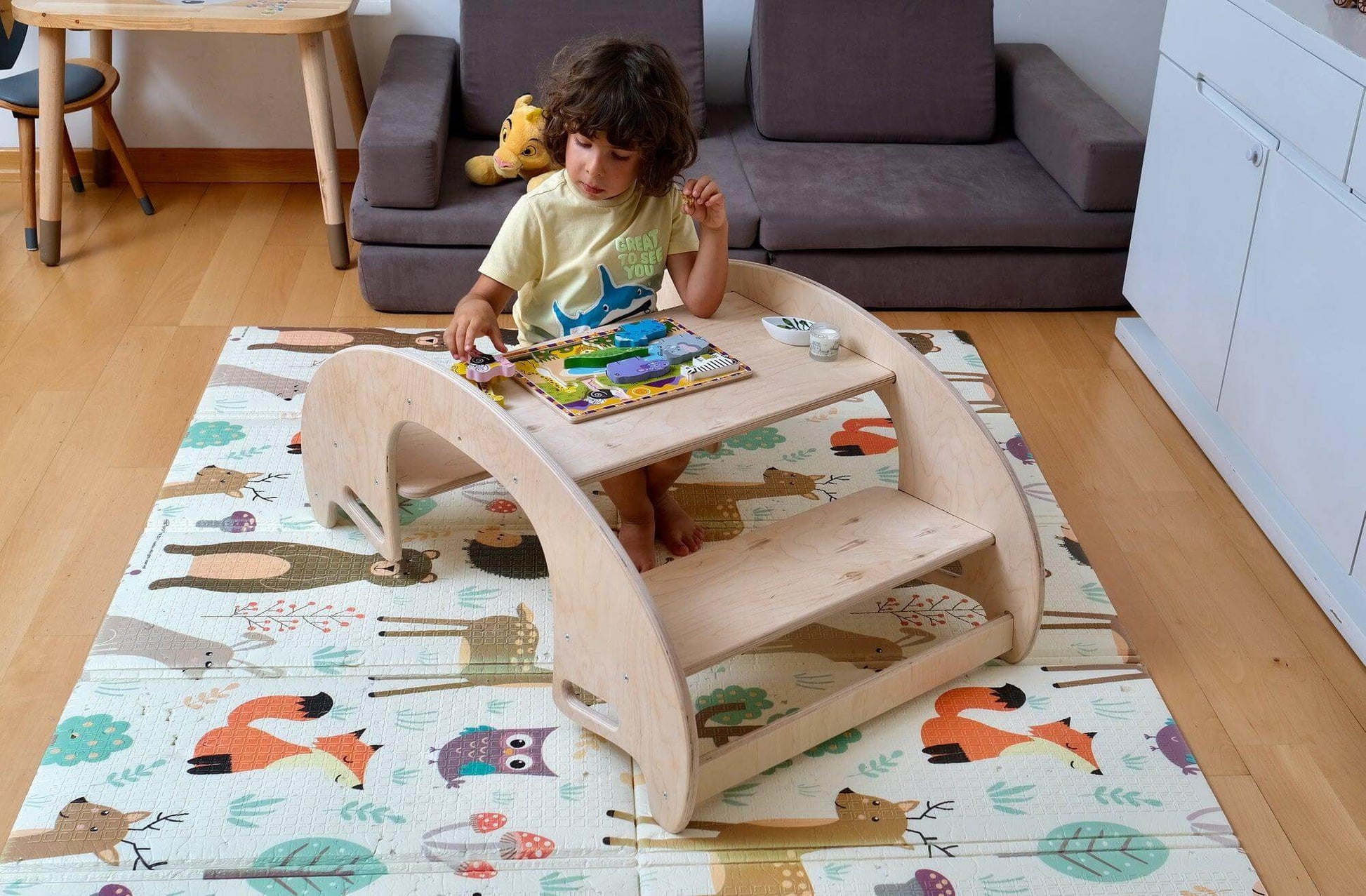 With just a simple turn, the seesaw becomes a child-sized table and chair set, ideal for meals, art projects, and hands-on learning.