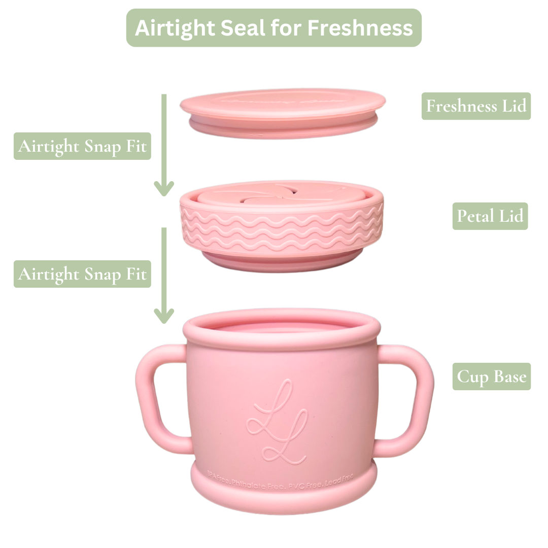 Comes with a snap-fit petal lid to prevent spills, and a freshness lid that securely seals for travel and snack storage—then tucks onto the bottom when not in use. It’s the ultimate mess-free, grab-and-go solution.